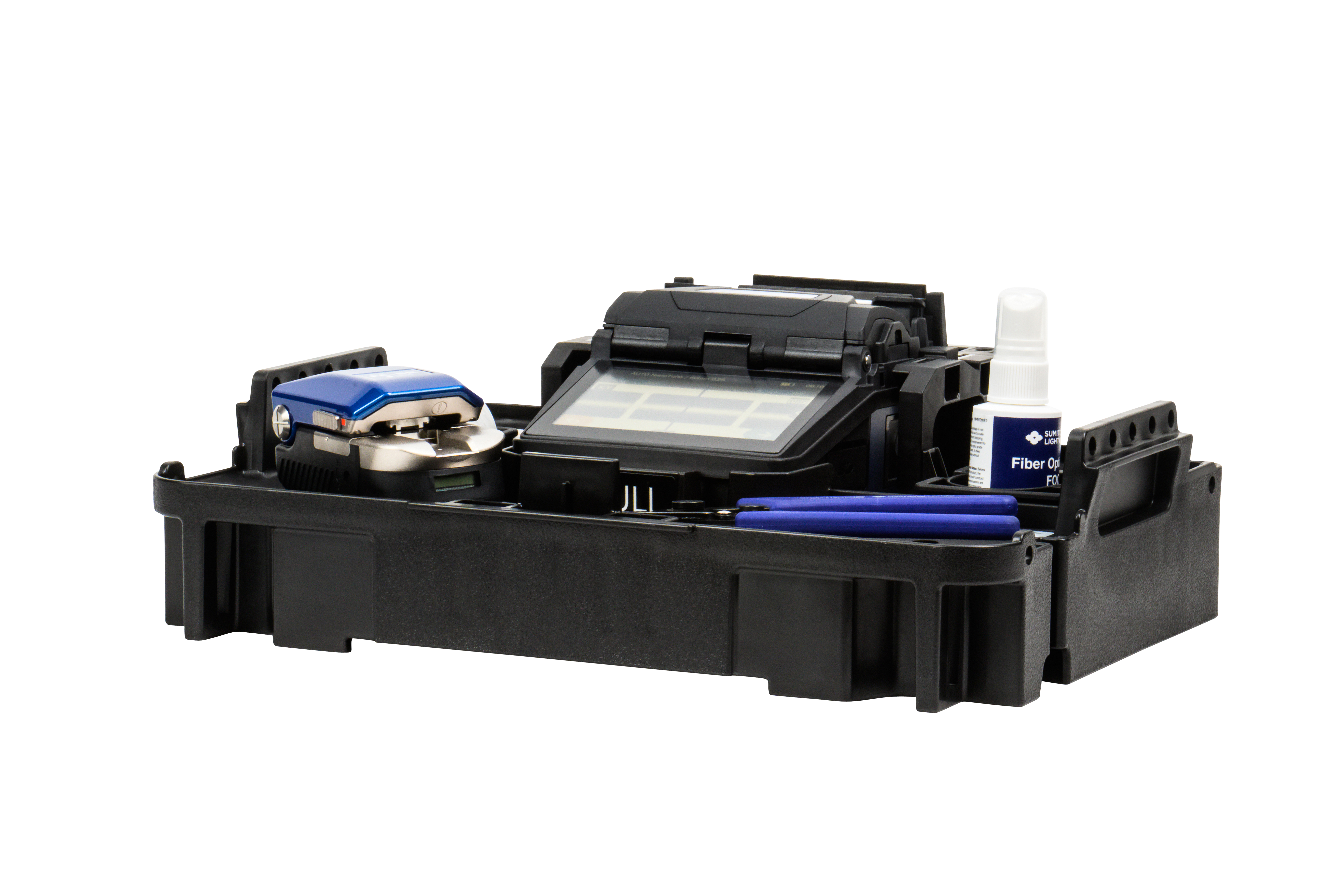 The Q502S Kit features a lightweight work tray that is ready for use immediately out of the carrying case and offers a built-in cooling tray and removable waste bin. This tray has been designed to affix the FC-6+ cleavers or attach the FC-8R with a lanyard. The multifunction tray makes it easy to stay organized while keeping tools at your fingertips. The tray utilizes metal plates that hold fiber holders and cutouts that hold preparation tools. The tray can be operated with straps, on a tripod or right out of the carrying case.
