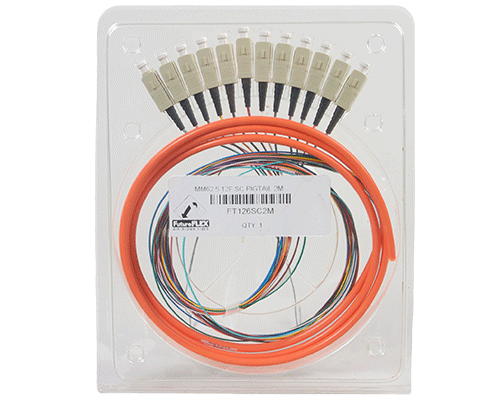 12-Fiber Pigtails are 2 meters (6.6 ft) in length and consist of twelve 900μm tight-buffer fibers in a distribution jacket.