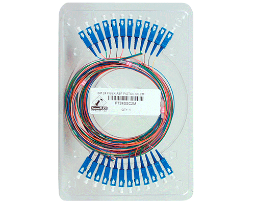 24-Fiber Pigtails are 2 meters (6.6 ft) in length and consist of twenty-four 900μm tight-buffer fibers organized into four groups of six. Approximately 1-inch long pieces of plastic spiral wrap are spaced equally along the 2-meter length of each 6-fiber group to keep them organized. Each spiral wrap is marked with a ¼-inch long piece of colored heat shrink to identify each fiber group.
