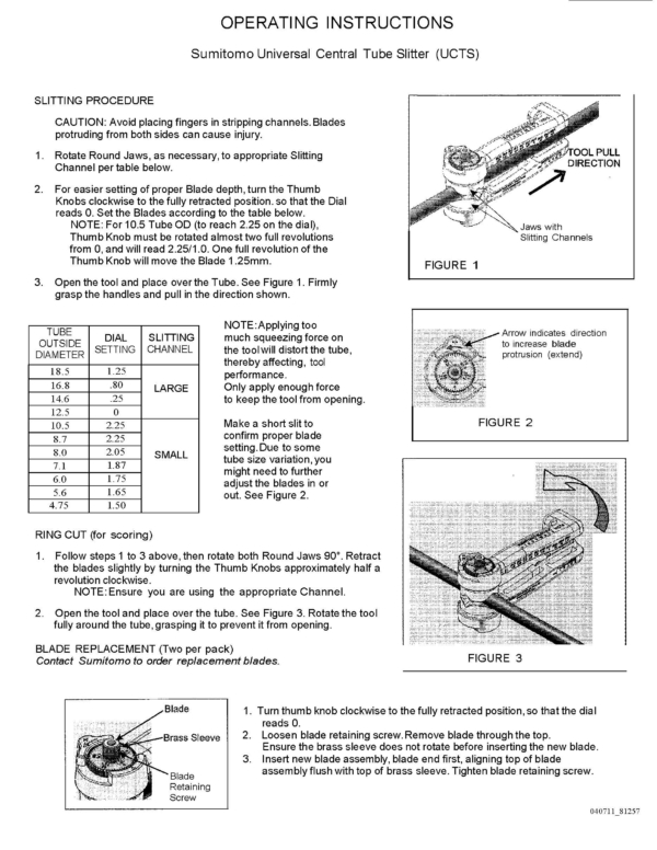 When slitting tubes, firm consistent pressure (squeeze) is needed to open tube correctly. Excessive pressure could cause the tube to collapse or become out of round and therefore making inconsistent cuts. When inserting into the tool, keep tube as straight as possible in the channel. Make a short slit to confirm proper blade setting. Due to some tube variation you may need to further adjust the blades in or out (see Figure 2).