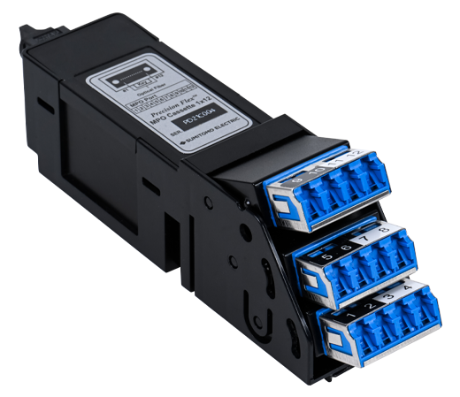 Sumitomo Electric’s PrecisionFlex® High Density MPO-LC Cassettes enables high capacity fiber connection between, for example, servers and switches. The LC adapters accommodates 144C / 1RU high density connections while featuring a tilt-up mechanism that enhances the workability of connectors.