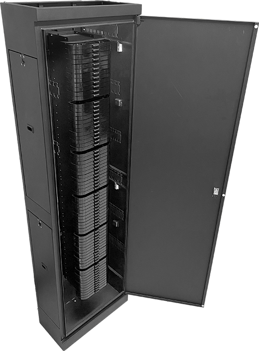The Hyperscale eXchange cabinet is a high-density floor-mountable optical splicing cabinet solution with a 20,736 ribbon fiber splice capacity, well suited for small and large data centers alike. Designed with splice trays organized down the cabinet center and with features such as removable cabinet side doors, users have easy access to attach and manage cable entry & exit and the associated slack management. Though high capacity, the cabinet has an efficient, compact footprint, thereby using less space.