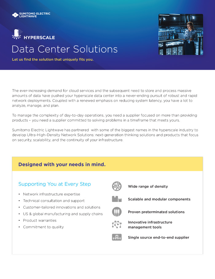 Sumitomo Electric Lightwave has partnered with some of the biggest names in the hyperscale industry to develop Ultra-High-Density Network Solutions: next-generation thinking solutions and products that focus on security, scalability, and the continuity of your infrastructure.